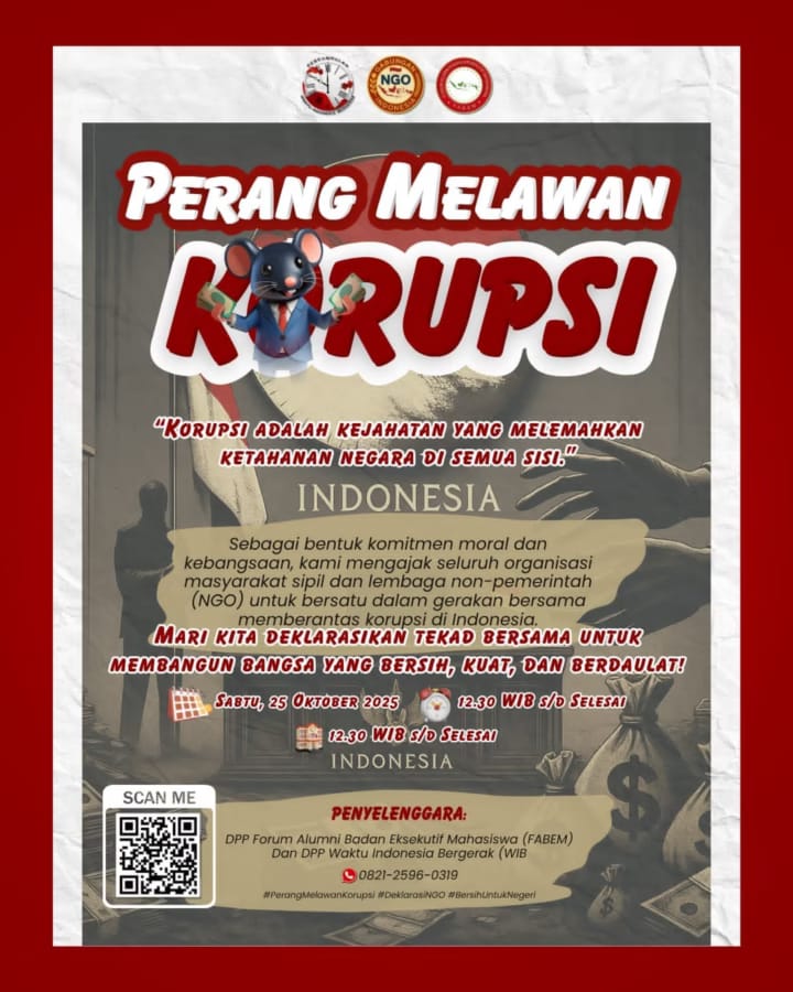 Jakarta, — Presesimedia.com Ratusan organisasi masyarakat sipil, lembaga swadaya masyarakat (LSM), organisasi kepemudaan, dan komunitas sosial siap bergabung dalam Deklarasi Gabungan NGO: Perang Melawan Korupsi yang akan digelar pada Sabtu, 25 Oktober 2025, pukul 12.30 WIB di Gedung Juang 45, Jakarta.
