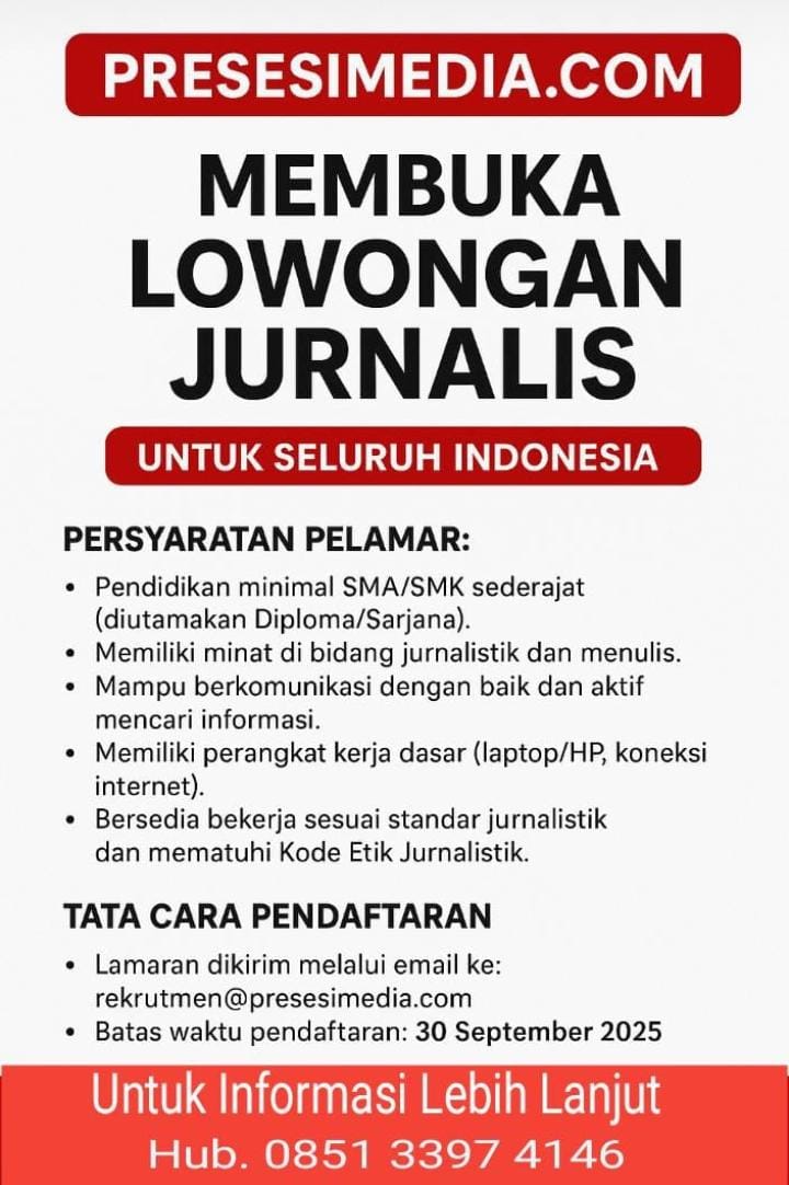 Sumatra Barat, 10 September 2025 – Dalam rangka memperluas jaringan pemberitaan dan meningkatkan kualitas informasi dari berbagai daerah, Presesimedia.com membuka kesempatan kepada putra-putri terbaik bangsa untuk bergabung sebagai Jurnalis/Wartawan dengan penempatan di seluruh wilayah Indonesia.