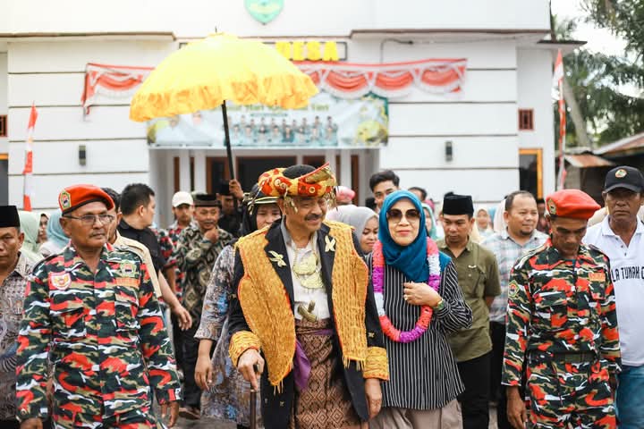 Dalam prosesi tersebut, Bupati Saipullah tampil mengenakan pakaian adat khas pesisir. Arak-arakan turut diiringi musik tradisional berupa perpaduan gendang dan biola, menambah nuansa kearifan lokal yang kental dalam penyambutan itu. Bupati tiba di lokasi sekitar pukul 15.58 WIB, bersama Ketua TP PKK Madina, Ny. Yupri Astuti Saipullah, serta rombongan.
